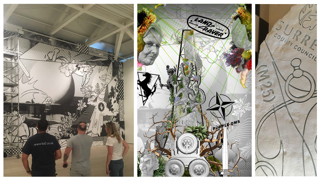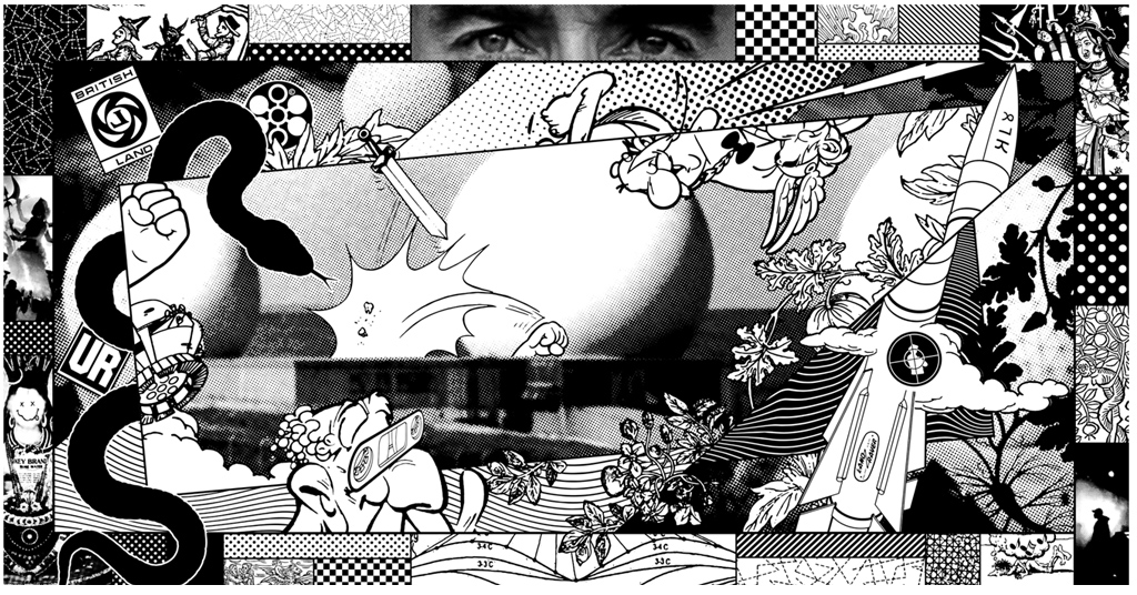 installation . the DJ Room at Sweet Harmony exhibiton.The room was called "Land Rover". A meditation on cold war and free parties of the 90's. The meeting of those ideas and the climate it came from, rebellion, the use of british property and land. headed up by Asterix the rebel who fought the empire.