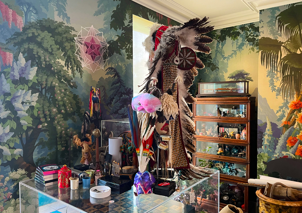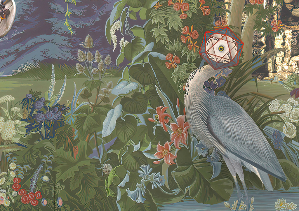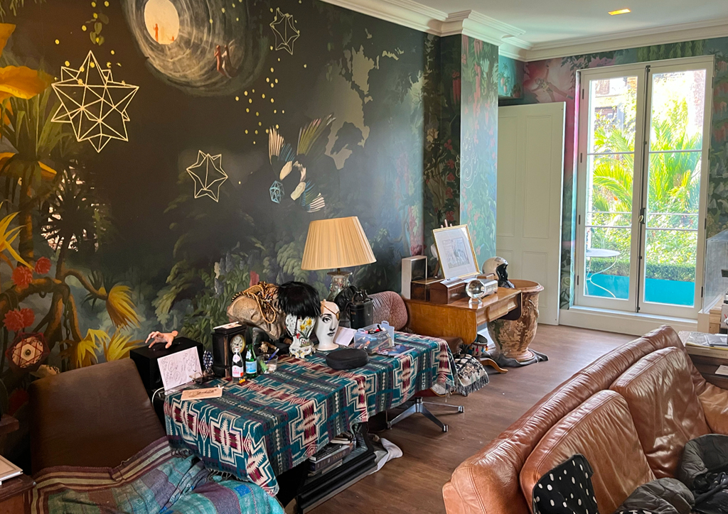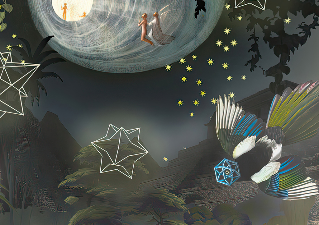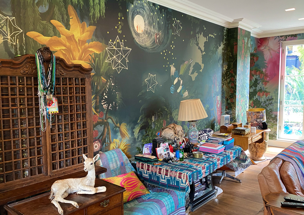 The wallpaper goes from night to day or day to night in a tropical paradise. Hidden amongst the foliage are esoteric, spiritual, artistic and cinematic images.