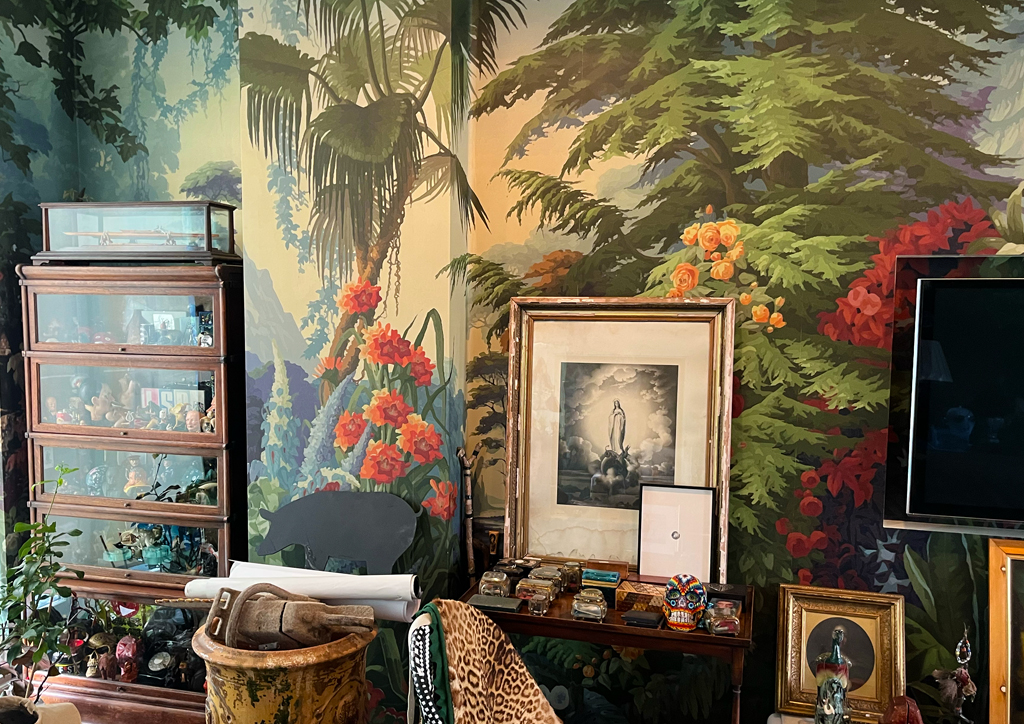 The wallpaper goes from night to day or day to night in a tropical paradise. Hidden amongst the foliage are esoteric, spiritual, artistic and cinematic images.